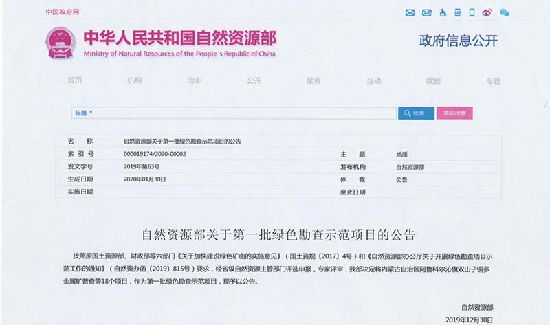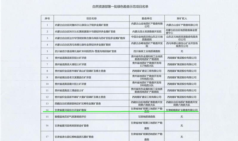 In order to innovate the management system and technical methods of geological exploration work, accelerate the establishment of a new era green exploration management system and standard specification system, promote the coordinated and healthy development of geological exploration and ecological environmental protection, and improve the energy resource guarantee capacity, natural resources on May 20, 2019 The General Office of the Ministry issued the notice of “Demonstration Work on Green Prospecting Projects”, the Natural Resources Department of Gansu Province issued the notice of “Implementation Plan of Green Prospecting Demonstration Work of Gansu Province”, Gansu Pagas Mining Exploration Co. The exploration rights of Guhe Exploration are recommended by the Natural Resources Department of Gansu Province as a green exploration demonstration project. On September 20, 2019, the provincial department passed the acceptance of the experts' achievements and reported to the Ministry of Natural Resources as the first batch of green exploration demonstration projects in the country.